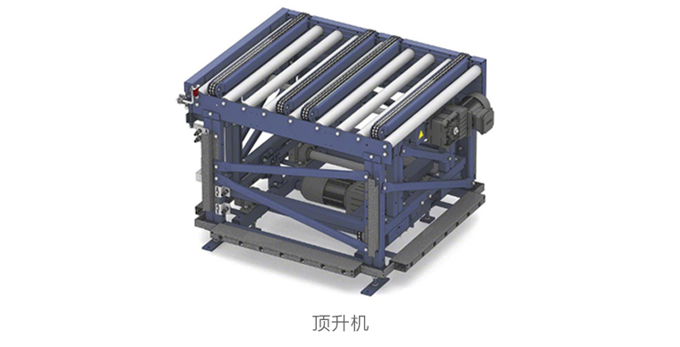 2、低位时,链条机上托盘可运行至顶升机上方,然后顶升机起升,通过顶部辊道或者链条将托盘送往其他方向的接口。